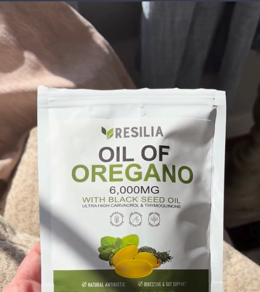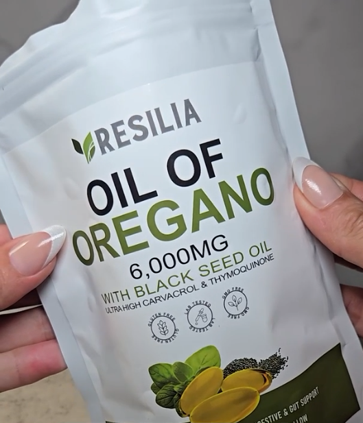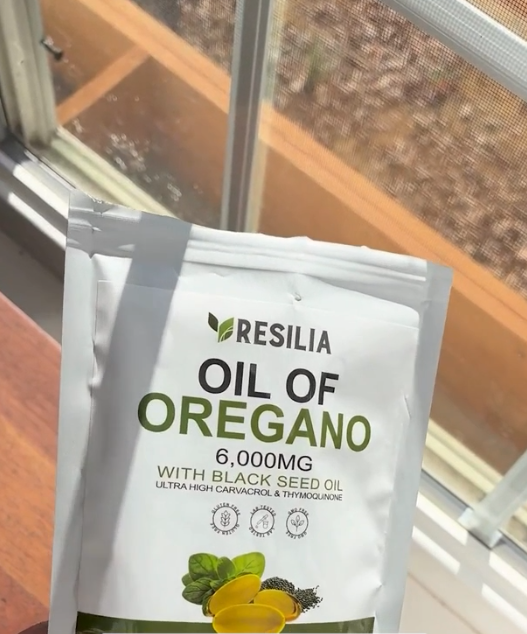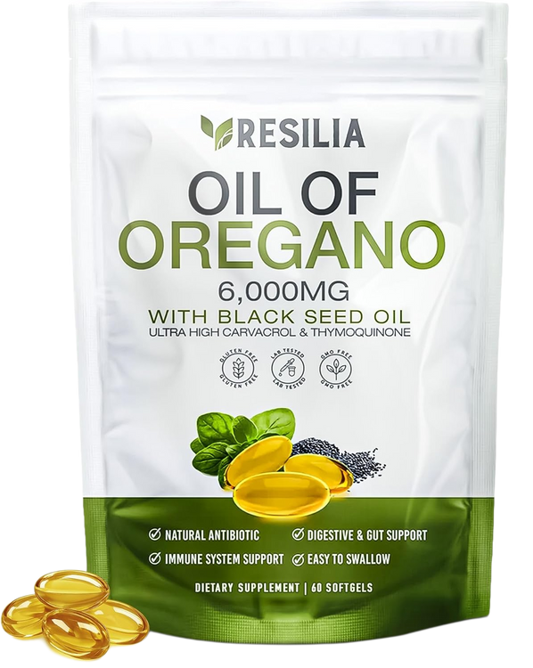 Resilia is a dual-action softgel supplement combining 6,000 mg of oregano oil and 200 mg of black seed oil to support immune health and gut flora.